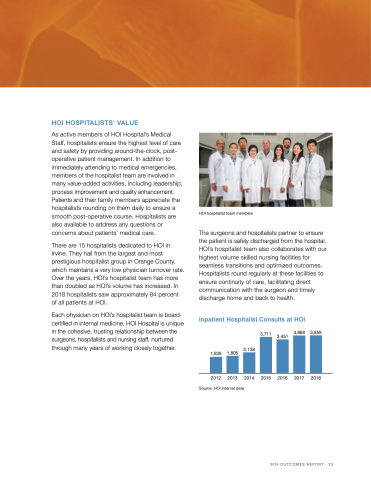 There are 15 hospitalists dedicated to HOI in Irvine. They hail from the largest and most prestigious hospitalist group in Orange County, which maintains a very low physician turnover rate. Over the years, HOI’s hospitalist team has more than doubled as HOI’s volume has increased. In 2018 hospitalists saw approximately 84 percent of all patients at HOI.