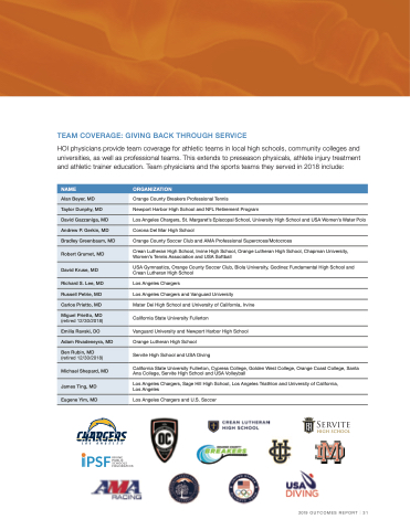 HOI physicians provide team coverage for athletic teams in local high schools, community colleges and universities, as well as professional teams. This extends to preseason physicals, athlete injury treatment and athletic trainer education. Team physicians and the sports teams they served in 2018 include: