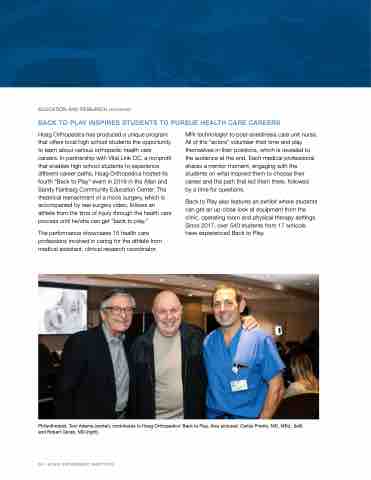 Hoag Orthopedics has produced a unique program that offers local high school students the opportunity to learn about various orthopedic health care careers. In partnership with Vital Link OC, a nonprofit that enables high school students to experience different career paths, Hoag Orthopedics hosted its fourth “Back to Play” event in 2019 in the Allan and Sandy Fainbarg Community Education Center. The theatrical reenactment of a mock surgery, which is accompanied by real surgery video, follows an athlete from the time of injury through the health care process until he/she can get “back to play.”