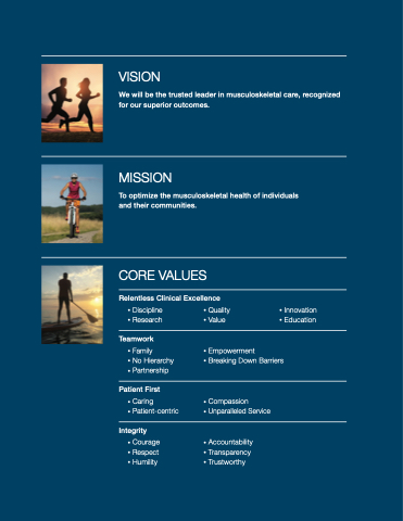 We will be the trusted leader in musculoskeletal care, recognized for our superior outcomes.