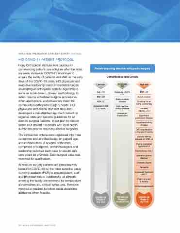 Hoag Orthopedic Institute was cautious in commencing patient care activities after the initial six-week statewide COVID-19 shutdown to ensure the safety of patients and staff. In the early days of the COVID-19 crisis, HOI physician and executive leadership teams immediately began developing an orthopedic specific algorithm to serve as a risk-based, phased methodology to safely resume scheduled surgical procedures, when appropriate, and proactively meet the community’s orthopedic surgery needs. HOI physicians and clinical staff met daily and developed a risk-stratified approach based on regional, state and national guidelines for all elective surgical patients. In our plan to reopen safely, HOI shared the details with local health authorities prior to resuming elective surgeries.