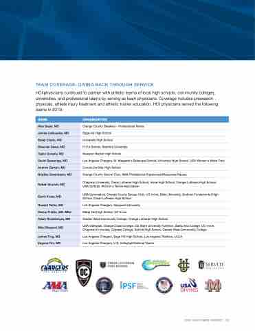 HOI physicians continued to partner with athletic teams of local high schools, community colleges, universities, and professional teams by serving as team physicians. Coverage includes preseason physicals, athlete injury treatment and athletic trainer education. HOI physicians served the following teams in 2019: