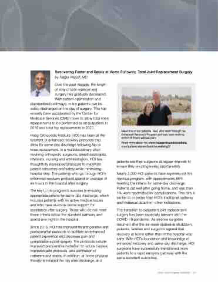 The transition to outpatient joint replacement surgery has been especially relevant with the COVID-19 pandemic. As elective surgeries resumed after the six-week statewide shutdown, patients, families and surgeons agreed that recovery at home rather than in the hospital was safer. With HOI’s foundation and knowledge of enhanced recovery and same-day discharge, HOI surgeons have successfully transitioned more patients to a rapid recovery pathway with the same excellent outcomes.